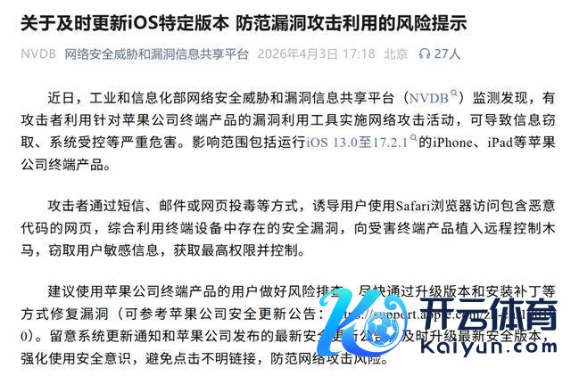 就在近日,工信部 NVDB 安全平台紧要提醒正在运行 iOS 13.0 至 iOS 17.2.1 的设备用户尽快升级系统。官方通报炫夸,有迂回者正在诈欺苹果 WebKit 的症结发动迂回,轻则秘密显露,重则设备被资料适度,风险极大。(Netskao)