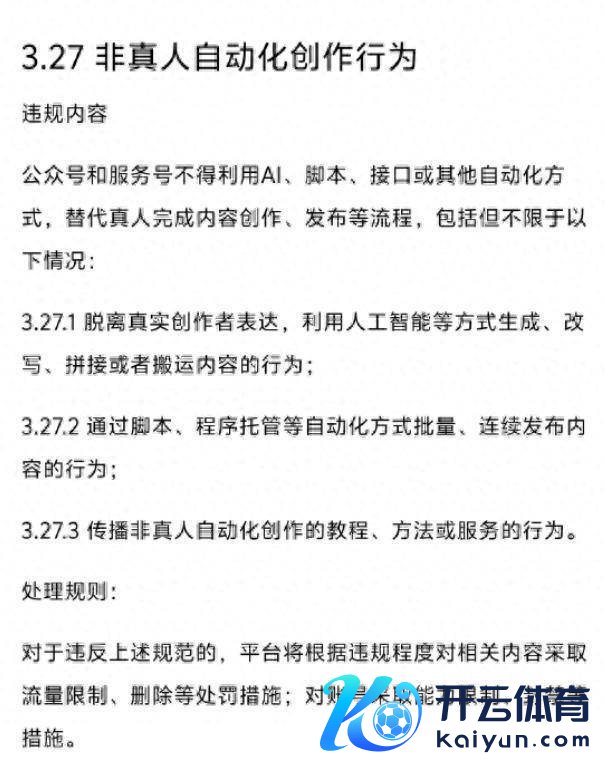 3月27日,微信公众平台新增“非真东说念主自动化创作步履”的限定,条目公众号和管事号不得运用AI、剧本、接口或其他自动化步地,替代真东说念主完成实际创作、发布等进程,其中包括:脱离真正创作家抒发,运用东说念主工智能等步地生成、改写、拼接概况搬运实际的步履;通过剧本、神志托管等自动化步地批量、联贯发布实际的步履;传播非真东说念主自动化创作的教程、方法或管事的步履。