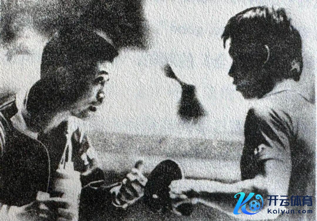 1983年第37届世乒赛,庄家富(左)为进入男单比赛的蔡振华作念临场引导。
